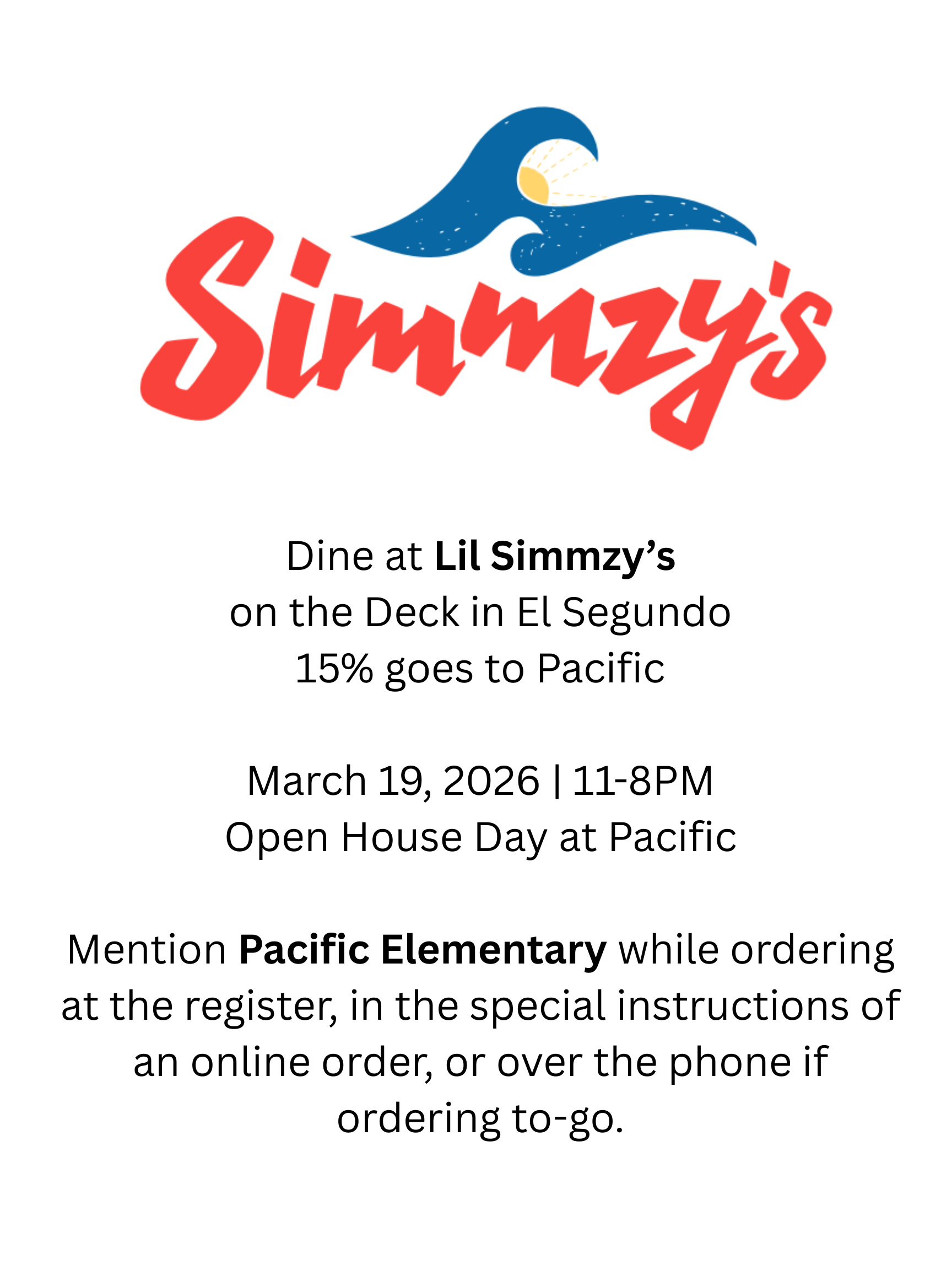 Dining Night Out Fundraiser Open House March 19 2027 Dine at Lil Simmzy’s on the Deck in El Segundo. 15% goes to Pacific - March 19, 2026 | 11-8PM Open House Day